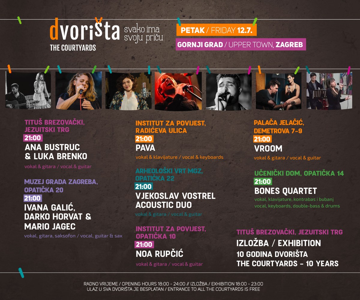 Zagrebška prireditev Dvorišta (brez vstopnin) bo odprta vsak dan od 18.00 do 24.00 ure, dnevni programi pa bodo objavljeni nekaj dni prej na družbenih omrežjih dogodka, priporočamo klik na www.facebook.com/dvorista.in in www.instagram.com/dvorista_thecourtyards.