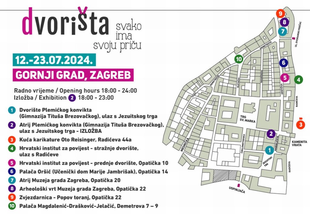 »Dvorišta« (slovensko bi lahko preprosto rekli »dvorišča«) že 10 let pripovedujejo zgodbe o Zagrebu, od 12. do 23. julija 2024 – za 12 dni – pa odprejo vrata zagrebških »gornjegradskih meščanskih palač« in postanejo središče urbane zabave, druženja, odkrivanja in živih glasbenih nastopov. Tudi letos pokukajte za njihova pročelja, saj vas na zagrebških dvoriščih čaka veliko presenečenj.