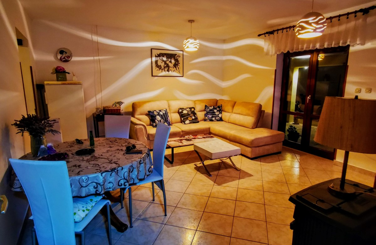 Hiter internet in velik TV z veliko satelitskimi programi delata brezhibno. Očarljivost prostora še poudarja zanimiva razsvetljava, številne drobne malenkosti, slike in cvetje v lepih vazah in posodah. Pozornost pritegne litoželezna peč in takoj vemo, da so tudi hladnejši, deževni ali turobni zimski dnevi in večeri ob prasketanju polen in toploti, ki se širi naokrog, tukaj prijetni. Iz dnevnega prostora vodijo vrata na teraso, samo korak in že smo v prelepi naravi.