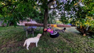 Pravi idiličen prizor – v senci pod velikim orehom je postavljena kovana miza ter stoli, ki kar vabijo h klepetu in počitku. Zraven svoje veje razprostira tudi murva in kar mimogrede roka zaide po sladke sadeže in jih zanese v usta. Na vejo je obešena še gugalnica, s katere nam ponese oko na vinograde in lepe travnike, obdane s kamnitimi zidci. Na malem vrtičku si lahko po želji naberemo zelišča in zelenjavo, pa tudi dišečo sivko, ki se v vijoličnih barvah maje v vetru.