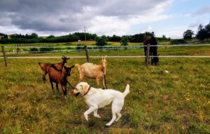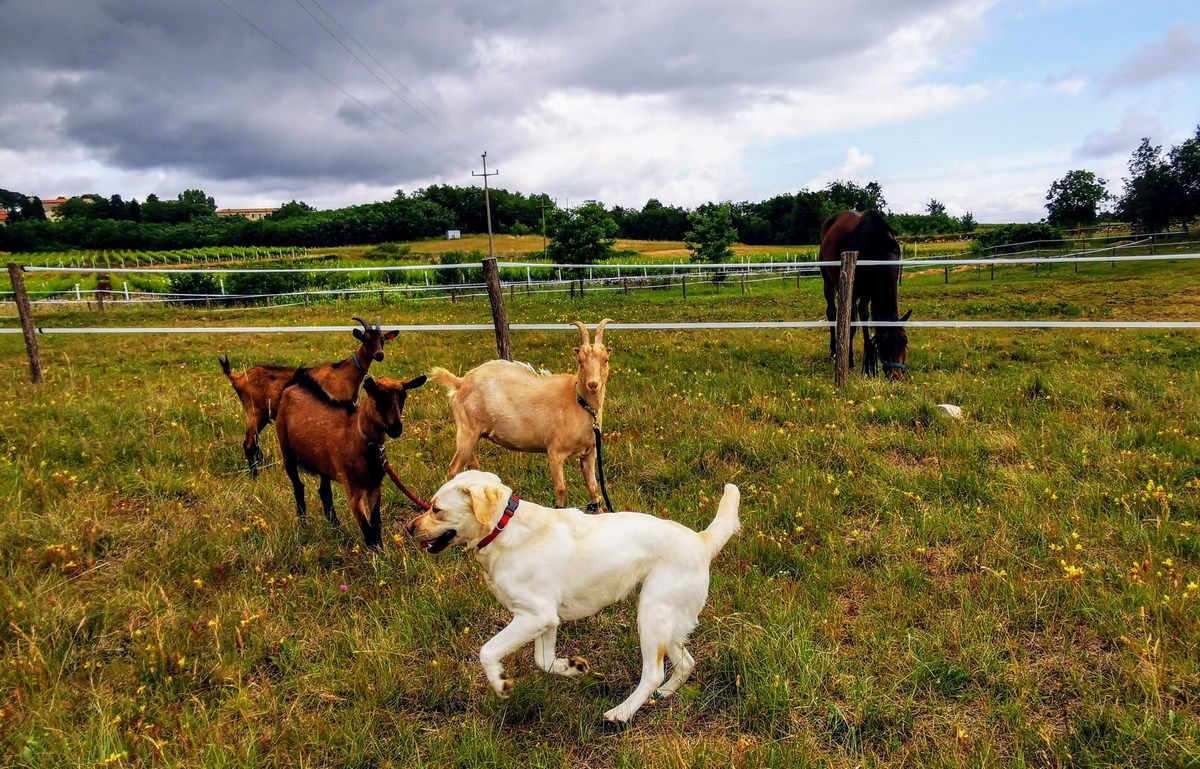 Družbo v novozgrajenem hlevčku mu delajo tri koze s prisrčnimi imeni: Tonka, Zvonka in Lola. Obožujejo čohljanje, za mestne ljudi, še posebej pa za otroke, pa bo zanimiva tudi dnevna molža. Sveže kozje mleko in sir lahko dobite tudi za zajtrk, prav tako domača jajca. Na posestvu so še zajci in ovca Mery ter jagnje z imenom Capuccino.
